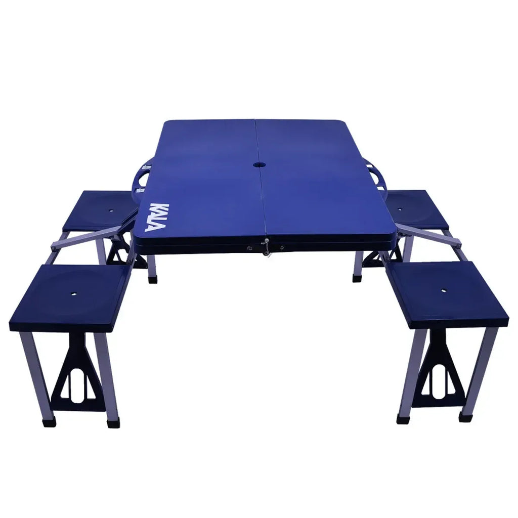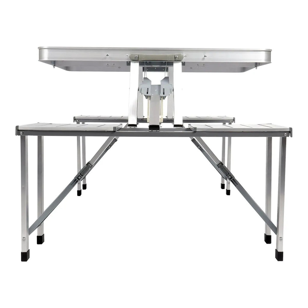 Portabilidade Suprema: Feita de alumínio leve, esta mesa é fácil de transportar e configurar onde quer que você vá. Suas banquetas se encaixam perfeitamente na estrutura da mesa, transformando-a em uma maleta compacta e prática para transporte.